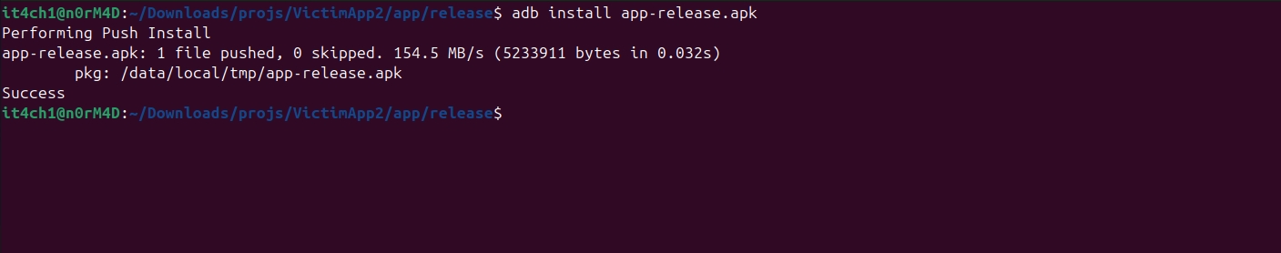 This shows that an unsigned, tampered application can be installed on a device without being detected by Android's security mechanisms. It proves that by using this method, it's possible to alter an app, recompile it, and install it without a valid signature, leaving the app's contents completely vulnerable.