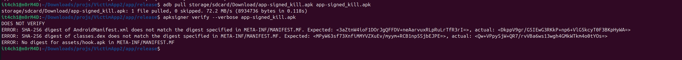 the specific part of the Android framework responsible for verifying an app's integrity. This injected code then intercepts the verification process and falsely reports to the system that the APK is still securely signed, even though its original signature has been stripped and its contents have been altered.