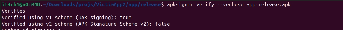 tool. This shows that the apk has been signed using the v1 signature scheme.