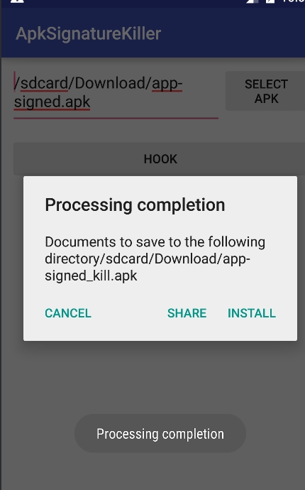 Here enters the ApkSignatureKiller who changes everything. Now let's just hook and modify our signed installed application using the ApkSignatureKiller. For this we have to push our signed application into the directory that can be accessed by the ApkSignatureKiller app just like the external storage directory.