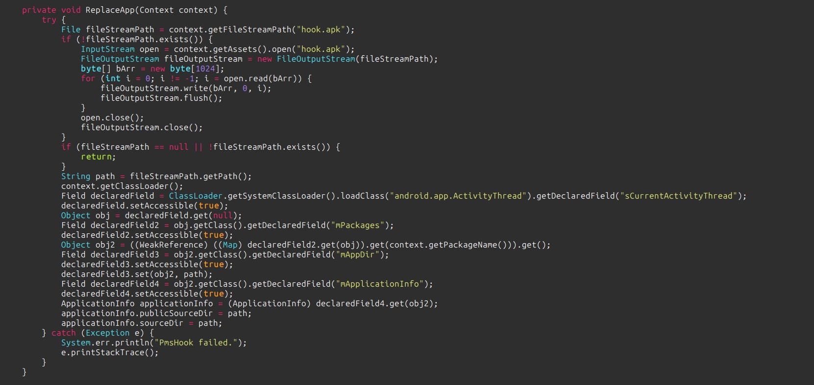 Then it uses this above method to replace the application with new application that does not have any signature verification mechanism and will always be verified by the Android signature verifier no matter how much the apk is tampered.