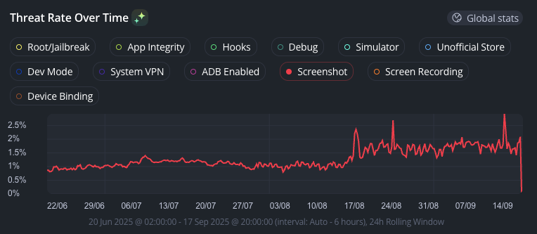 <figure><img src="https://1548930415-files.gitbook.io/~/files/v0/b/gitbook-x-prod.appspot.com/o/spaces%2FNjTFXsqCLQ3RU2oA2uHC%2Fuploads%2FIBamHC2bT5khtFXu1jxW%2Fimage.png?alt=media&#x26;token=af7aec91-adeb-4785-a86c-d92fd0108e7f" alt=""><figcaption><p>Global Threat Rate for Screenshot (source my.talsec.app)</p></figcaption></figure>