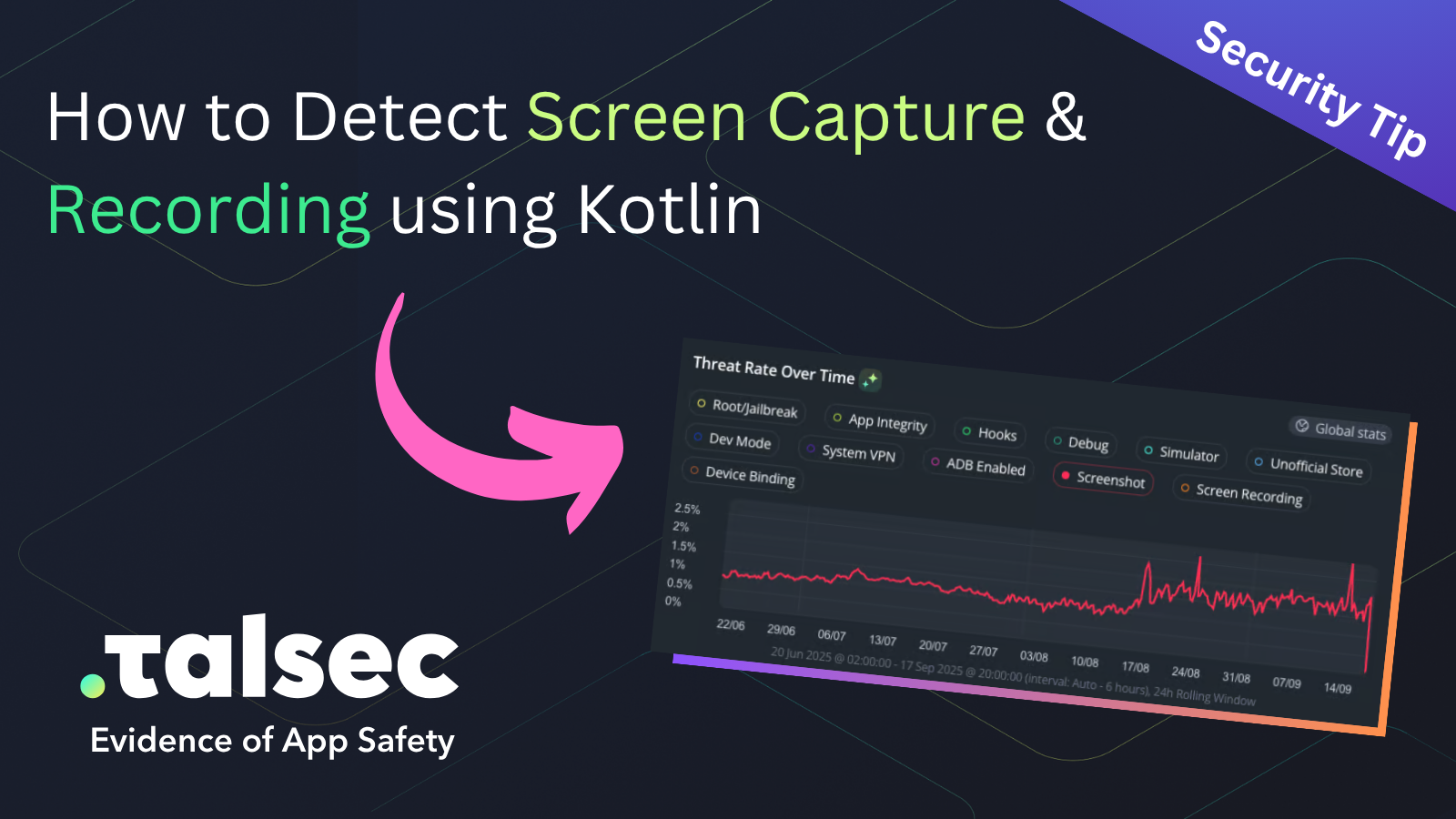 <figure><img src="https://1548930415-files.gitbook.io/~/files/v0/b/gitbook-x-prod.appspot.com/o/spaces%2FNjTFXsqCLQ3RU2oA2uHC%2Fuploads%2F1VQl6GZk7qejy6ra9uxN%2Fimage.png?alt=media&#x26;token=a4911670-ffe8-4d69-902a-61b7e179f362" alt=""><figcaption><p>Global Threat Rate for Screen Recording (source my.talsec.app)</p></figcaption></figure>