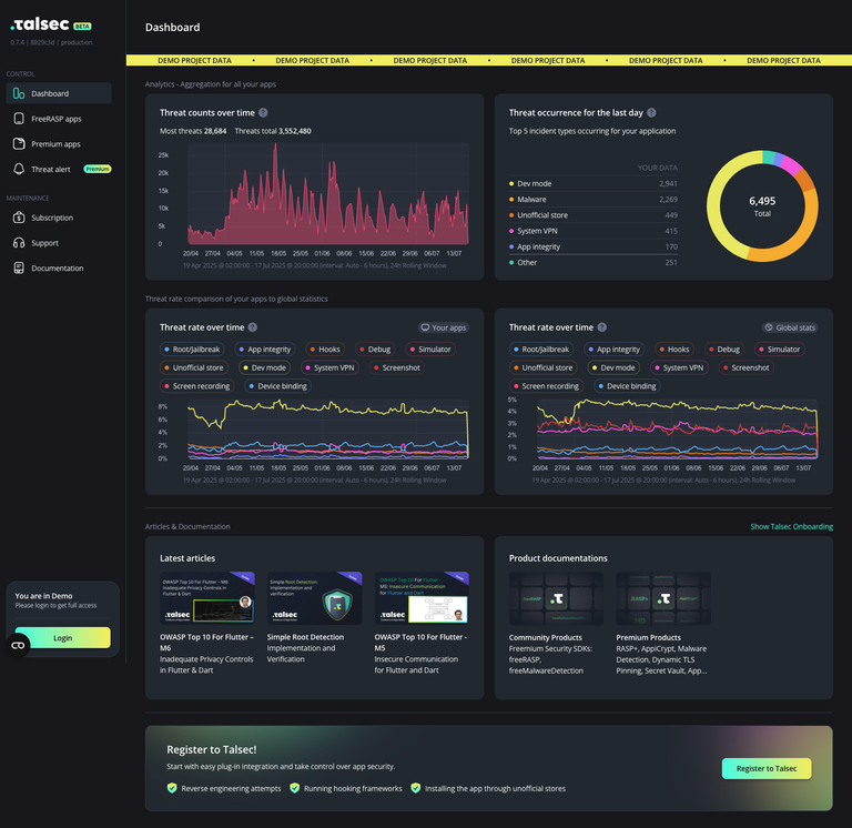 We are thrilled to introduce Talsec Portal, a comprehensive platform designed to provide **interactive charts**, **readable security intelligence** (such as data on rooted devices, fraudulent app clones, and unofficial store installations), and **detailed security data** for all your applications in one centralized place. The portal allows you to **interact with the data yourselves**, **benchmark your app against global statistics**, and use these insights to decide which protections to apply based on your specific threat landscape.