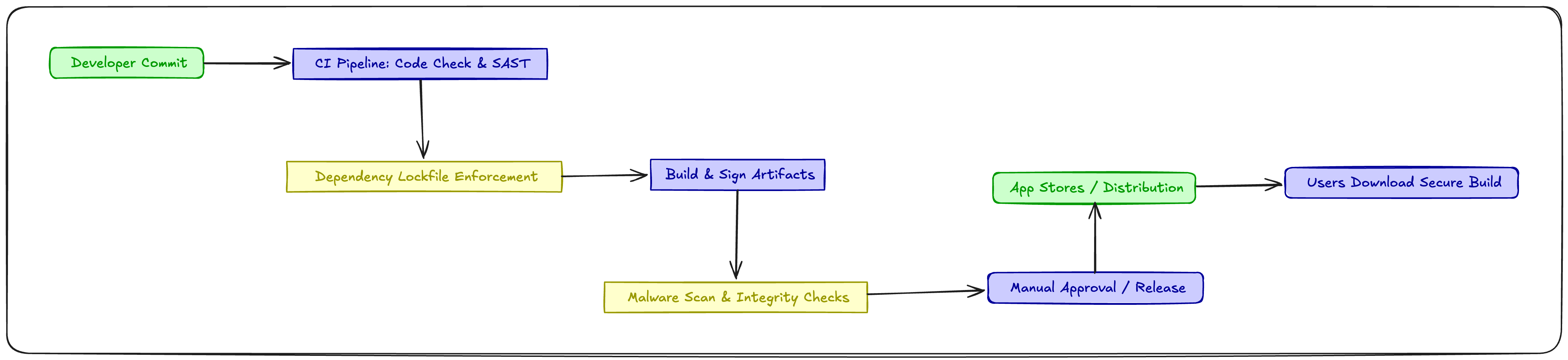 .jks) or iOS (.p12) signing keys are compromised, attackers could publish malicious app updates. Secure keys using encrypted storage (e.g., GitHub Secrets, AWS KMS) and regularly rotate keys to mitigate potential damage.Artifact Tampering: Without verifying final binaries (