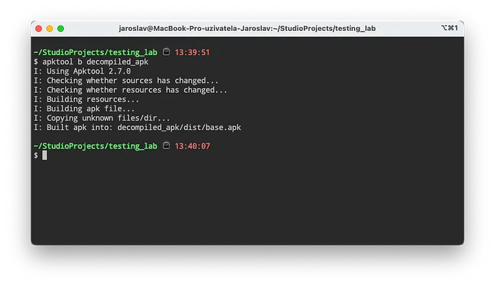 To decompile the APK, we will use the **apktool d** command. We are also going to set the output directory for better clarity.