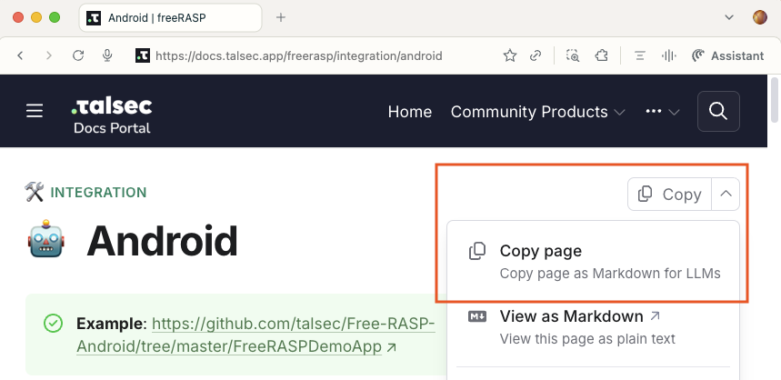 2. Navigate to[ https://docs.talsec.app/freerasp/integration/android](https://docs.talsec.app/freerasp/integration/android). In the top right corner, click the arrow next to the copy button and choose the "Copy page" option.